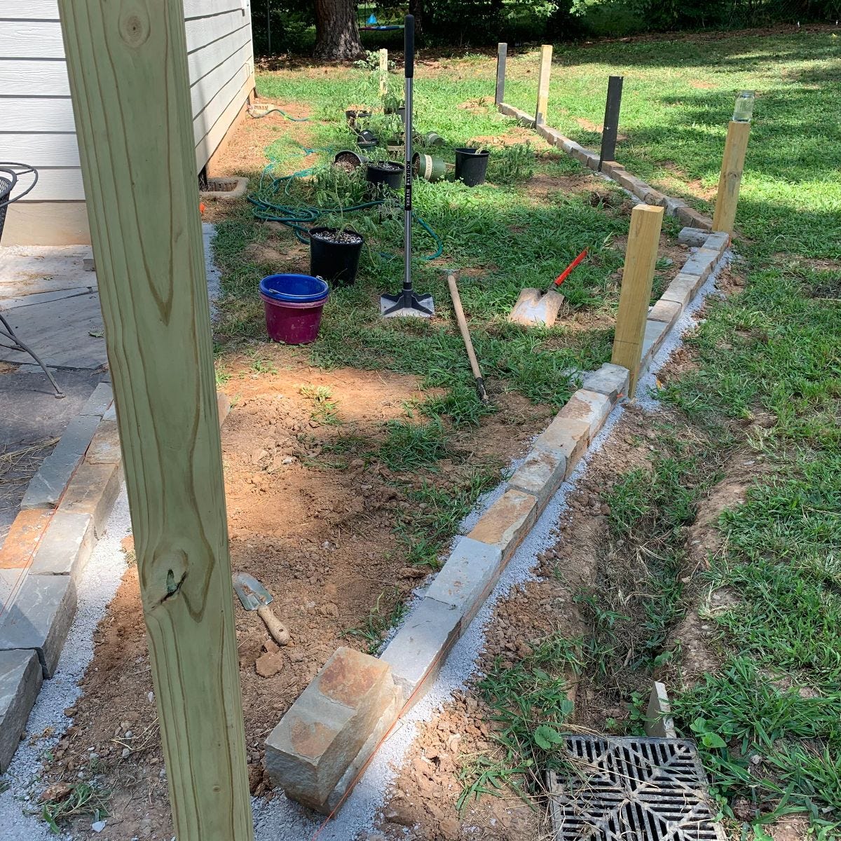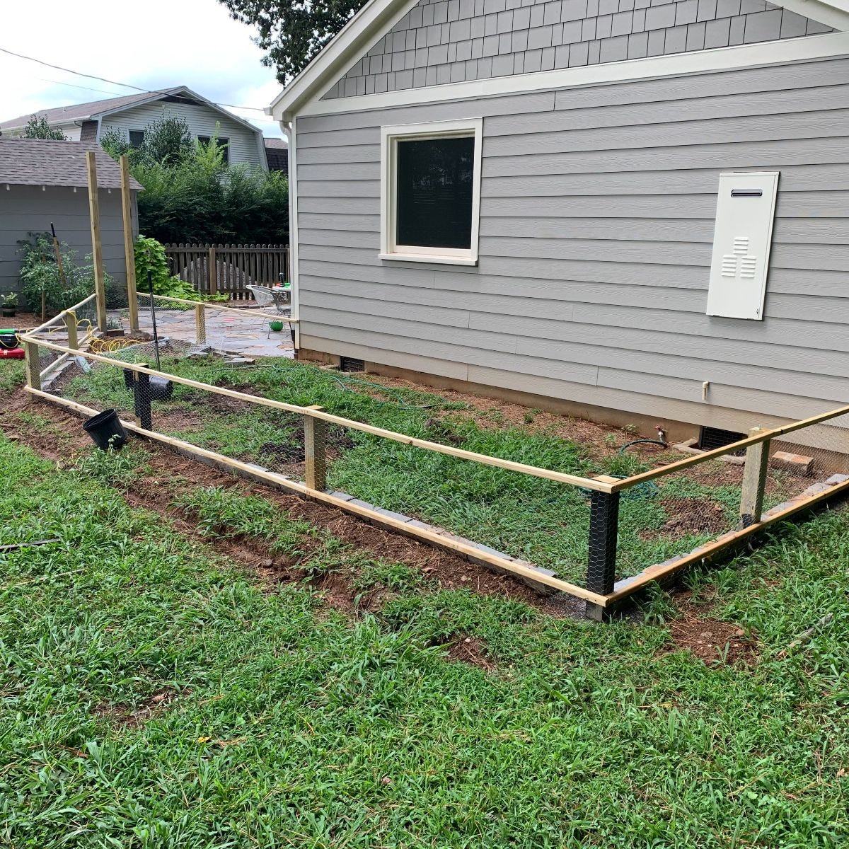 In this picture you see where I added some pitiful, gravel infested soil because I needed to level out the ground a few inches. The soil was what I had and was mixed with some gravel that was leftover from a patio project. I regret using this soil. The soil is fine... Not great, but itls fine. What's annoying is the gravel that got mixed in. I will be picking little stones out forever now.