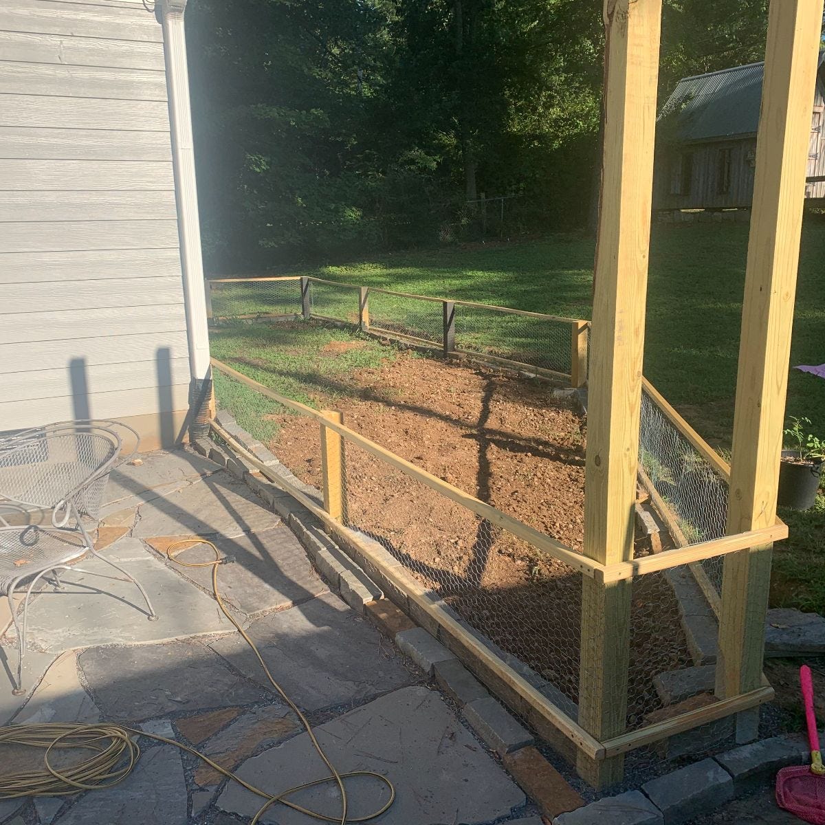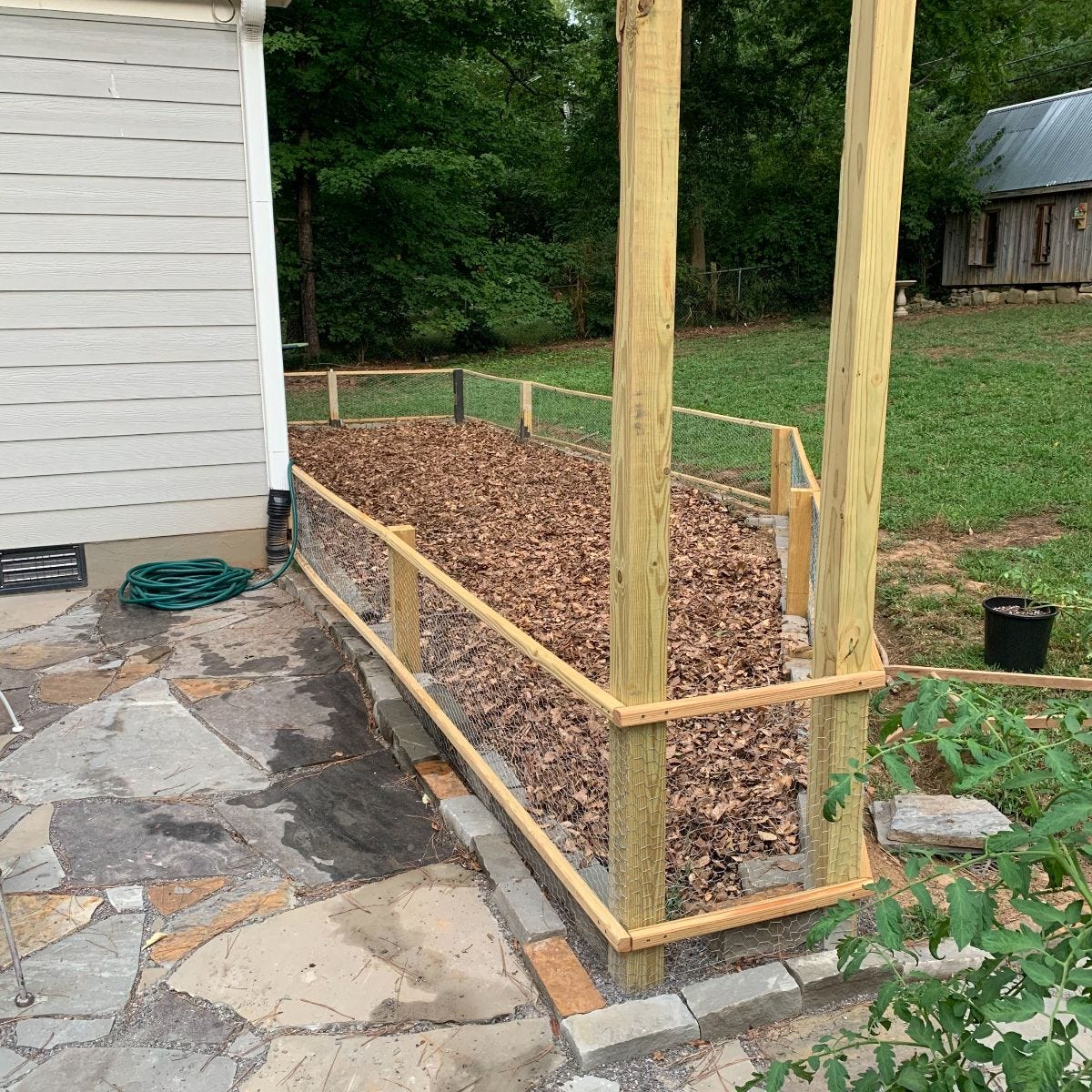 I had to build a fence to keep the bunnies and my dog (Moose) out. I put some stone I had at the base. I did this to make it easier to keep it clean around the base of the garden and give me a few extra inches of height.