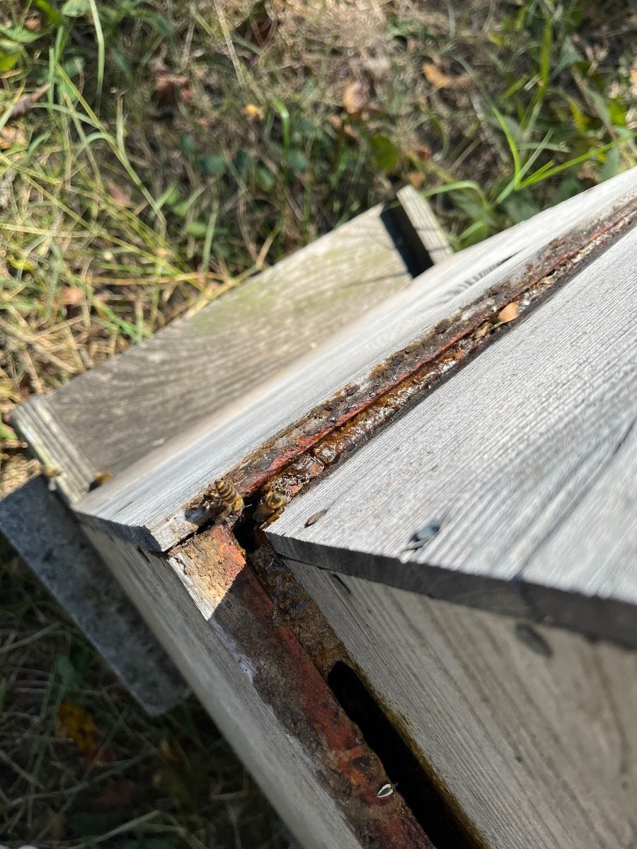 Looking from the top down. An opening like this allows water in and unwanted air circulation. Not ideal. If you look closely, you can see where the bees began closing up the space. They still had a ways to go.