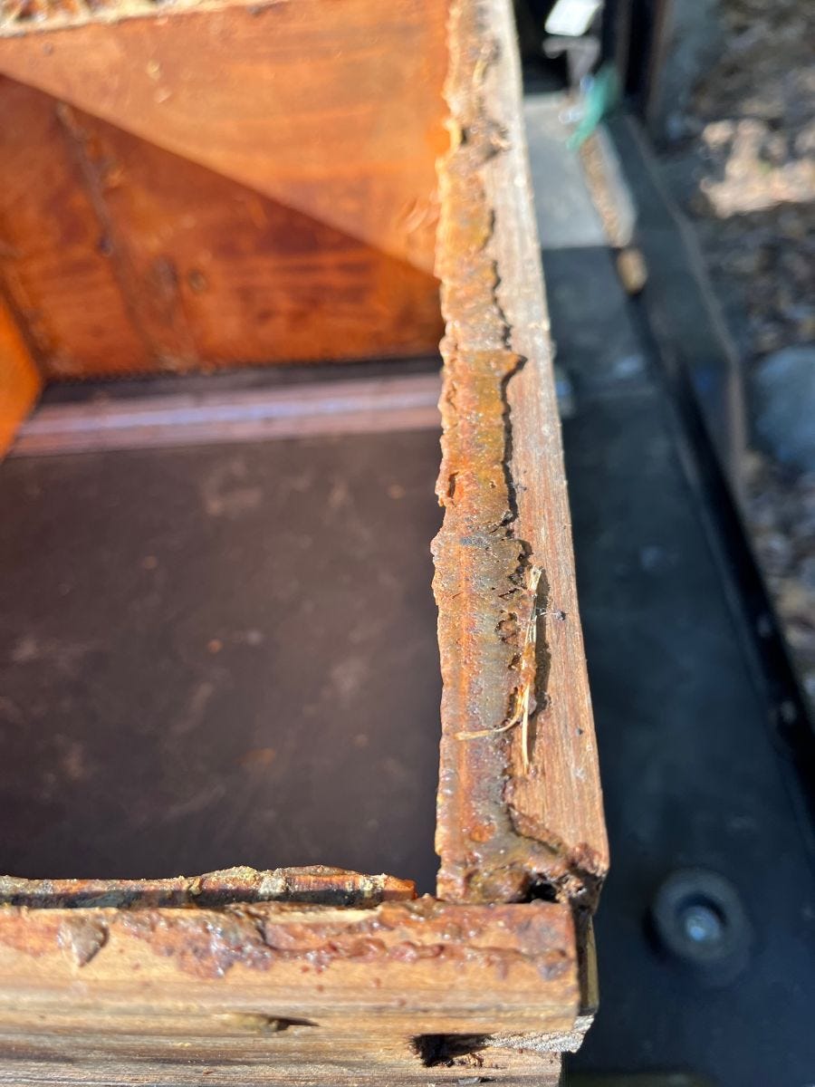 Here is the hive as I left it. I broke apart the boxes and straightened them up. The gap between the boxes is from built up propolis. This is the back of the hive. These two boxes make up the brood chamber and space for the bees to store honey for themselves.