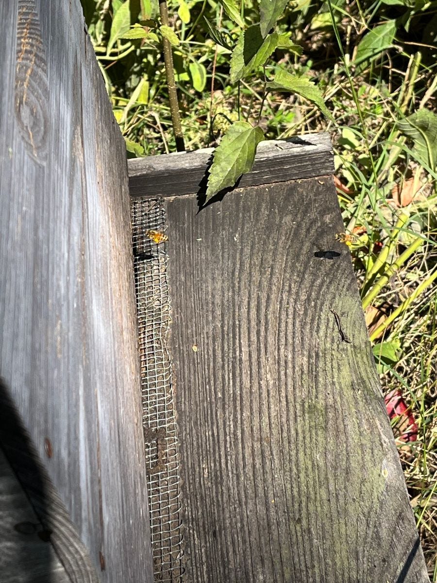 In this picture, you are looking from the top of the hive down the front towards the bottom where the opening is. There are two bees in this picture. There is one that is just about to enter. And one not too far behind it, just crossing the threshold of the platform. Each bee has pollen it has collected attached to its left leg. It's color is a lighter shade of yellow than it's body. I specifically look for this each time I visit the bees. If bees are carrying pollen inside the hive, that means there is active brood. And active brood means active queen! And that's what I want! This is how I check the health and presence of the queen without opening her chambers.