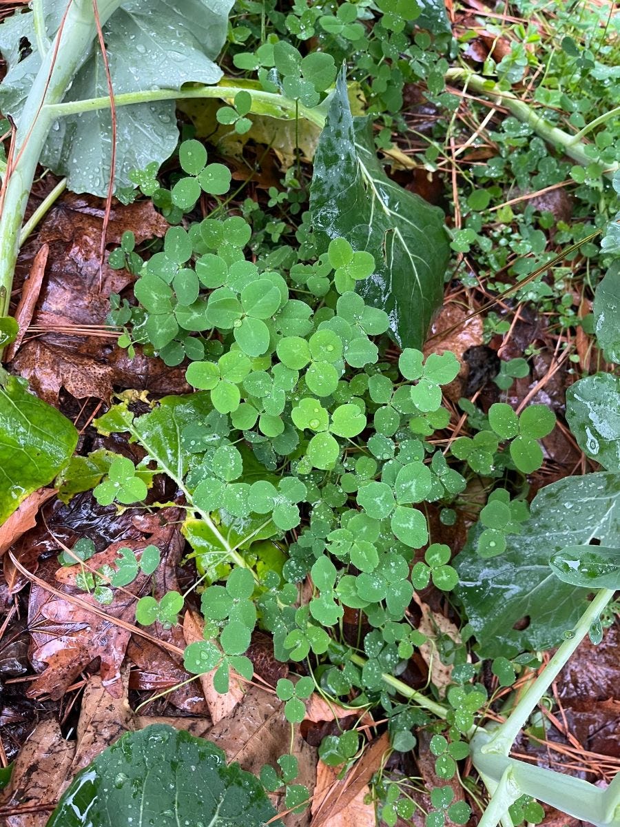 Some red clover we seeded between the broccoli and Brussel sprouts. It's a legume, so it helps put nitrogen in the soil, attracts pollinators when it blooms, AND best of all - is a great medicinal plant. Morgan uses it in teas.