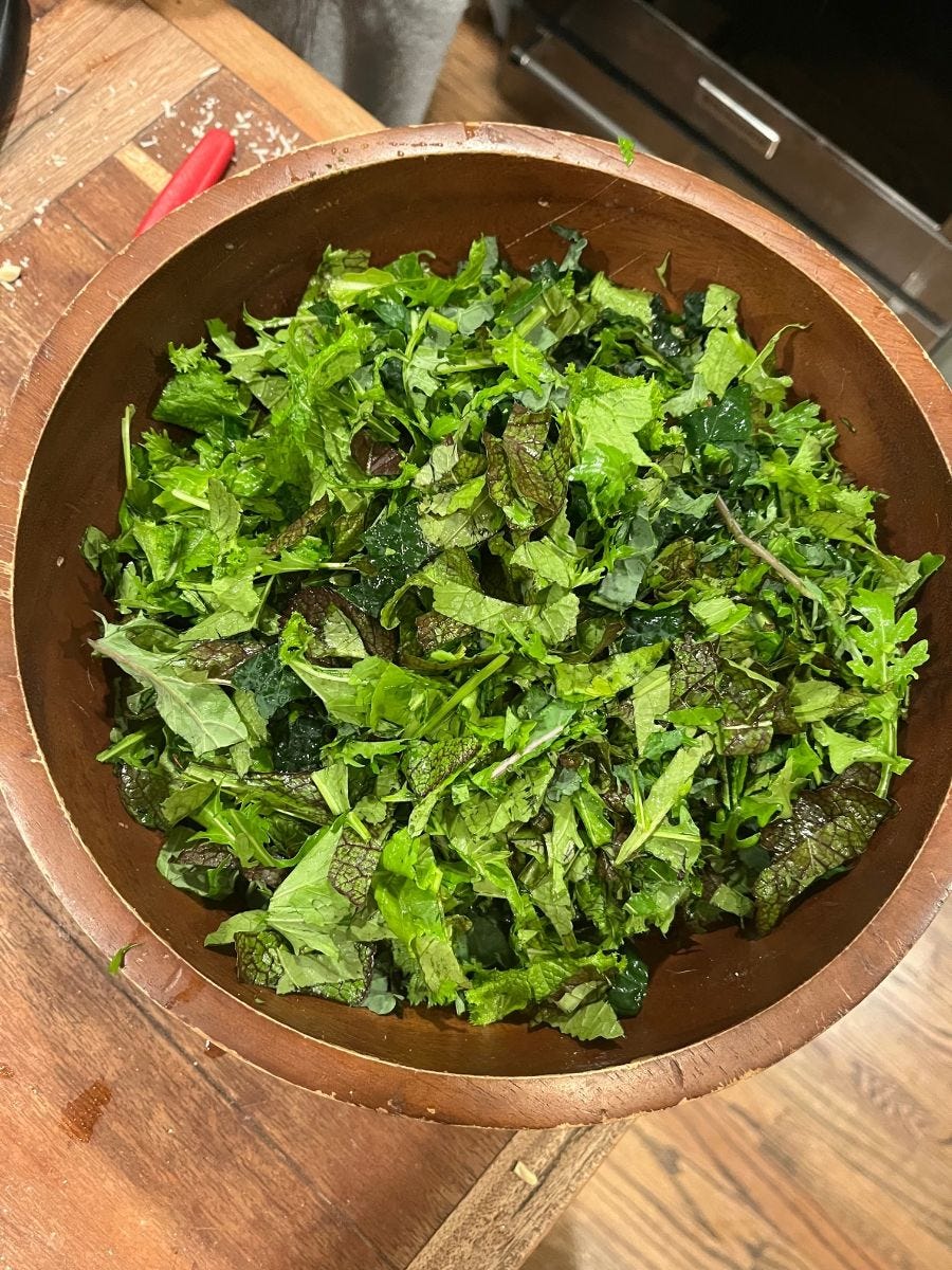 A bowl of chopped salad greens from the garden: Kale, Arugula, Mustards, Collards, Turnips, Mizuna