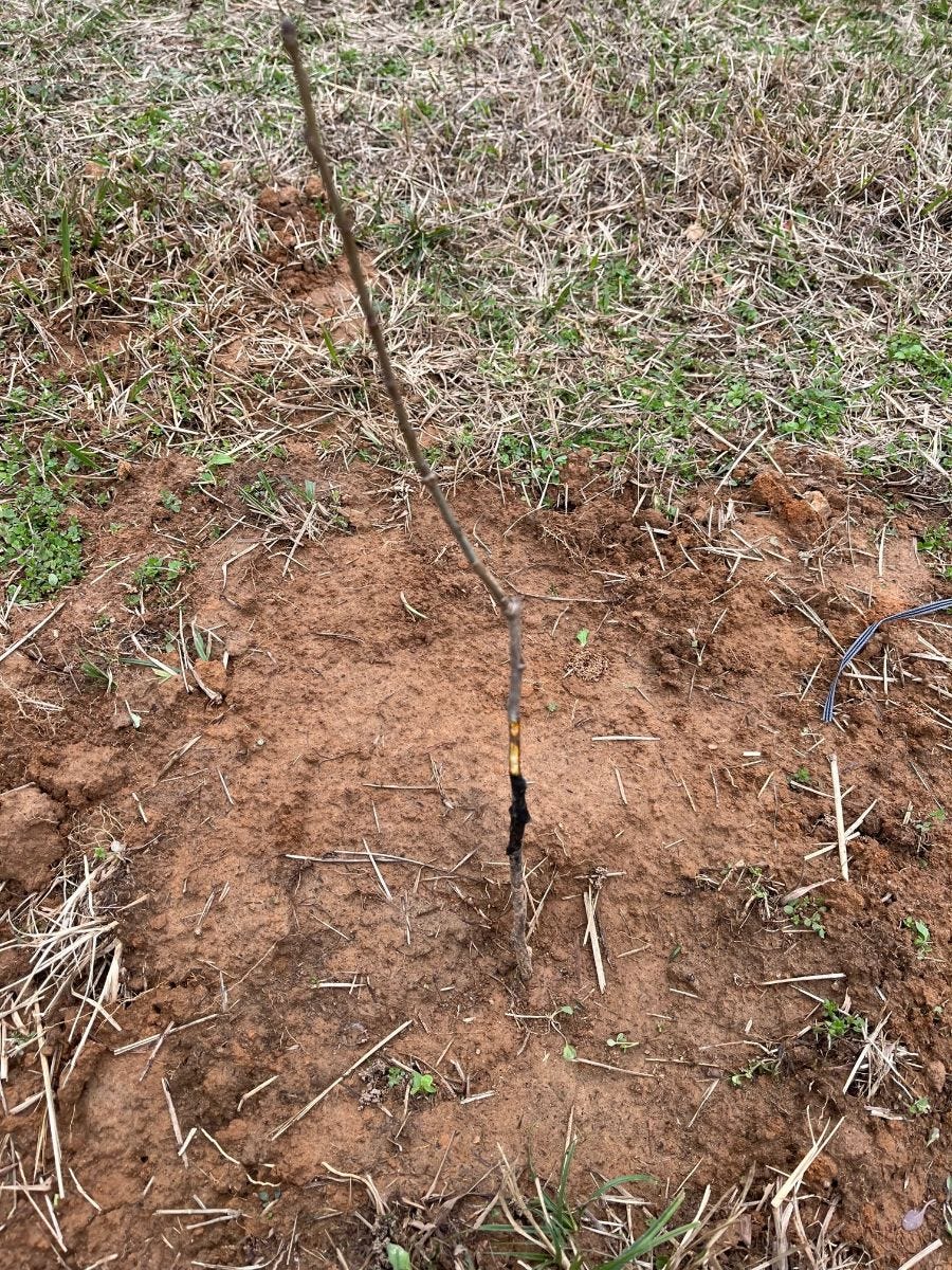 This is a grafted apple tree. If you look closely you will see the black tape where the "scion" was grafted to the rootstock. The "scion" is usually selected for its fruit, while the rootstock is selected for its vigor and disease resistance. In this picture, look right above the black tape and notice the white spots along the scion. That's where some critter decided to taste the tree. Another reason I'm excited about the tree guards.