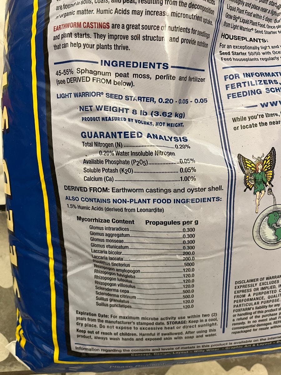In ep.7 of the podcast I mentioned flipping the bag over and making sure the seed starting mix didn't have NPK in it. That's not exactly right. What I should have said, was I wanted to make sure the bag wasn't getting its NPK (or fertilizer) from chemical agents. This bag is getting its nutrients (NPK) from Earthworm castings and Oyster Shell. Once I saw this, I was good with it. The mycorrhizae added to the bag was icing.