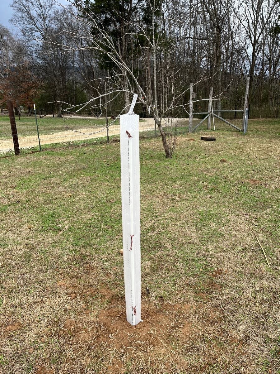So this time around, I was excited to use tree guards or "grow tubes". First, they tubes will keep deer off of the trees until they are well established. Secondly, the guards will form a nice micro climate and protect the trees on windy days as well as freezing nights.