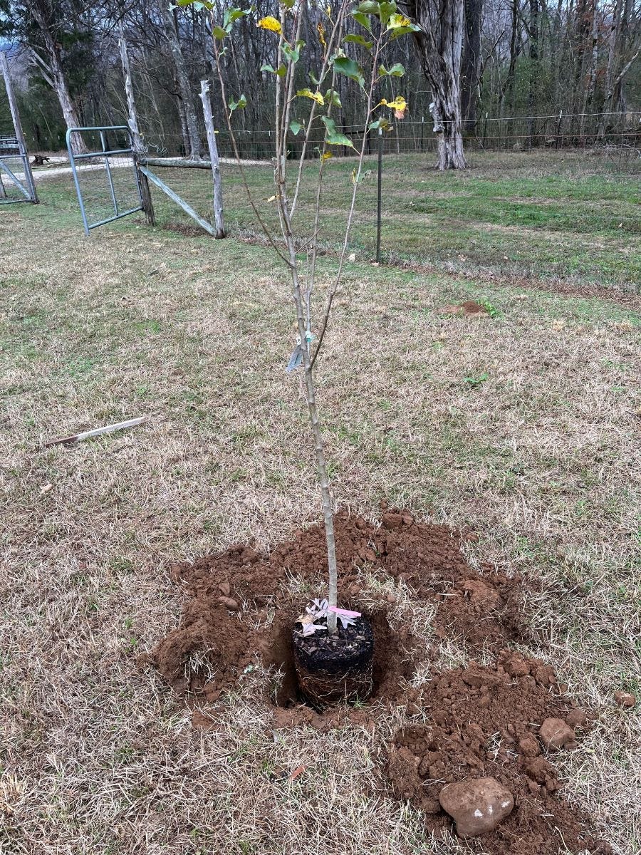 Potted apple tree going in the ground.