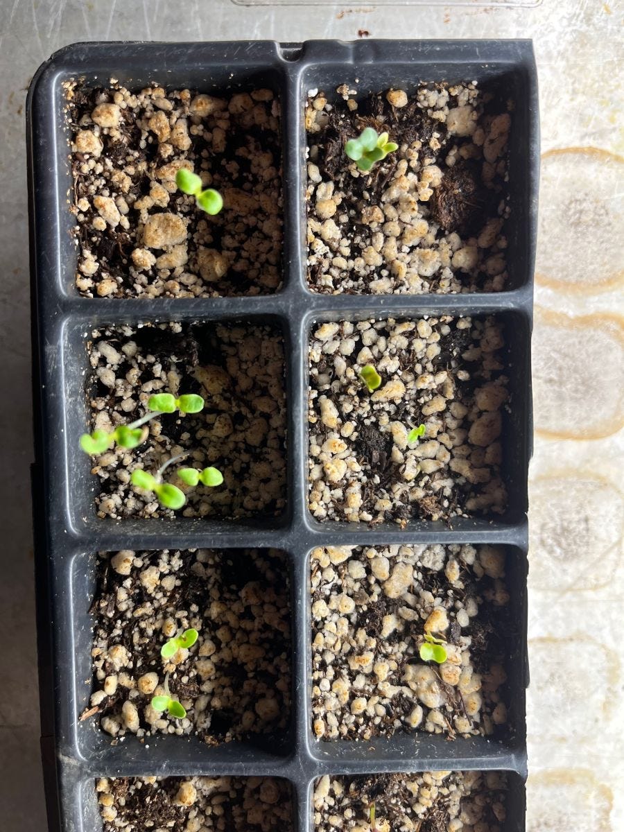 Lettuce and kale seedlings emerging.