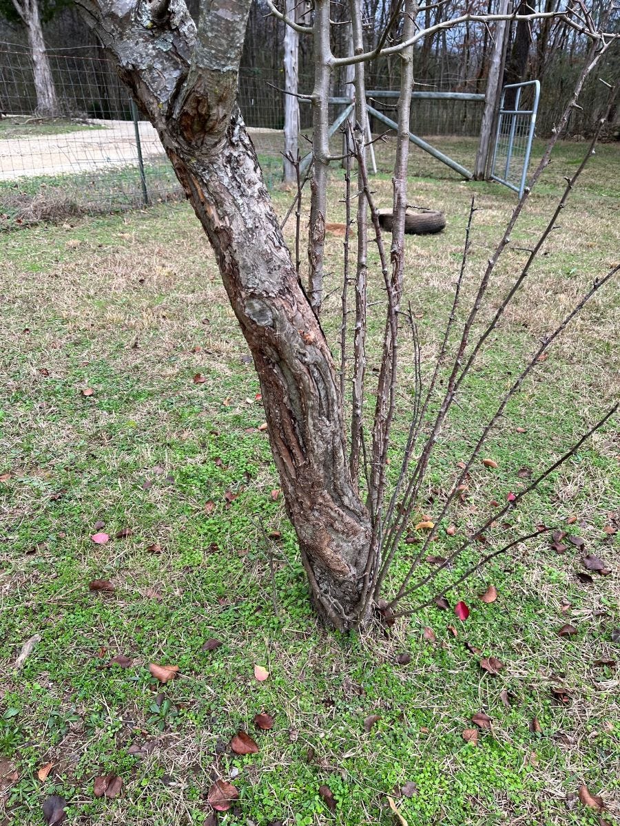 Here is a 7 year old pear tree. It's the lone survivor from 10+ trees planted in 2016. The scars along the trunk are from deer damage. The "suckers" or growth coming form the base of the tree is growth coming from the rootstock. It's NOT what we want and should be trimmed back. Because the tree is dormant, I will wait to trim until very late winter. This is good practice because the tree will need to actively heal itself once cut to prevent being exposed to disease, etc. In some cases, pruning or trimming too early can induce the tree to come out of dormancy before its time and this isn't ideal either.