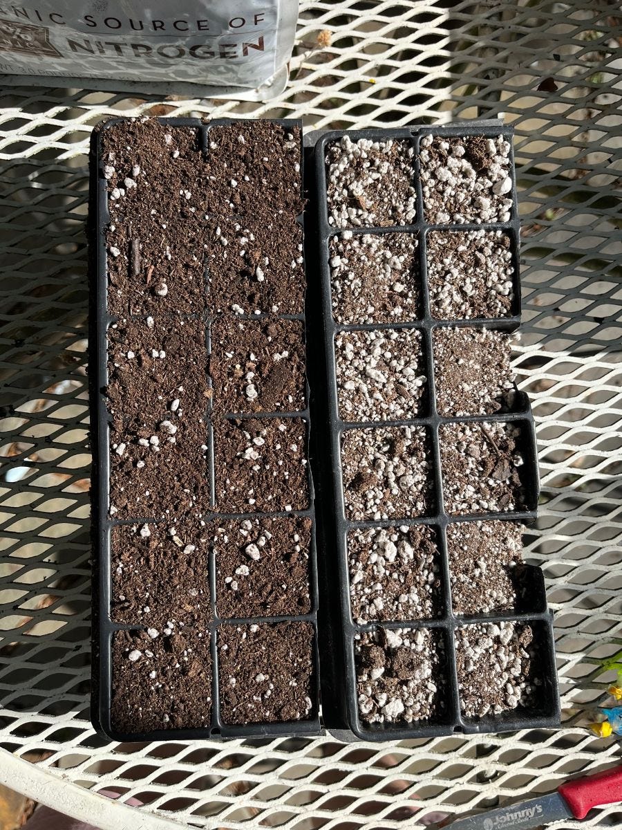 We also changed out the seedling soil mixture. In the past, I have always made the seedling soil mix myself. I'd mix in peat moss, compost, some organic fertilizers, and a few other things here and there. I never measured. Since I am now trying to help others by providing guidance, I decided I needed to find a more straightforward solution and a ready mix that others could buy at the store instead of going through the trouble of mixing it themselves. But now I'm worried the local seedling mix I got is no good. This is what I am testing first.