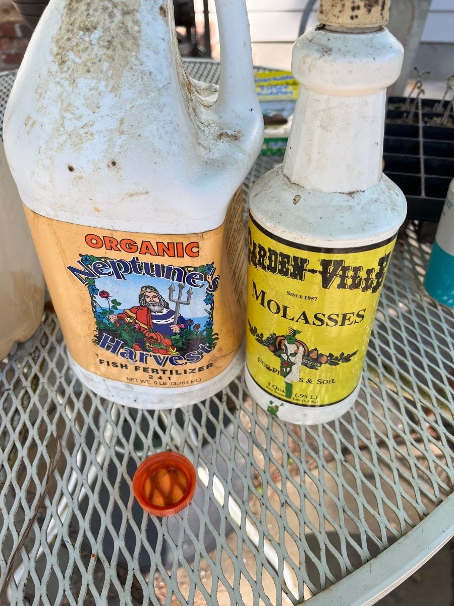 This is what I've been using to fertilize in the garden. I've had the fish fertilizer since my market garden days (~7 years) and the mollasses I bought at a nursery 3+ years ago. It was going out of business and the owner was practically giving it away. The fishe fertilizer has some nutrients in it, but its also feeding the microbes in the soil. The molasses is almost solely used for feeding and increasing bacterial populations in the soil. This bacteria is beneficial for my garden plants and helps them access the nutrients available in the soil. I put a dab of the fish and a dab of the mollasses in an old milk carton, add non-chlorinated water from my Berkey (so I don't kill any microbes) and then drench the soil around my plants. I use in the garden and to fertilize my berries and fruit trees.