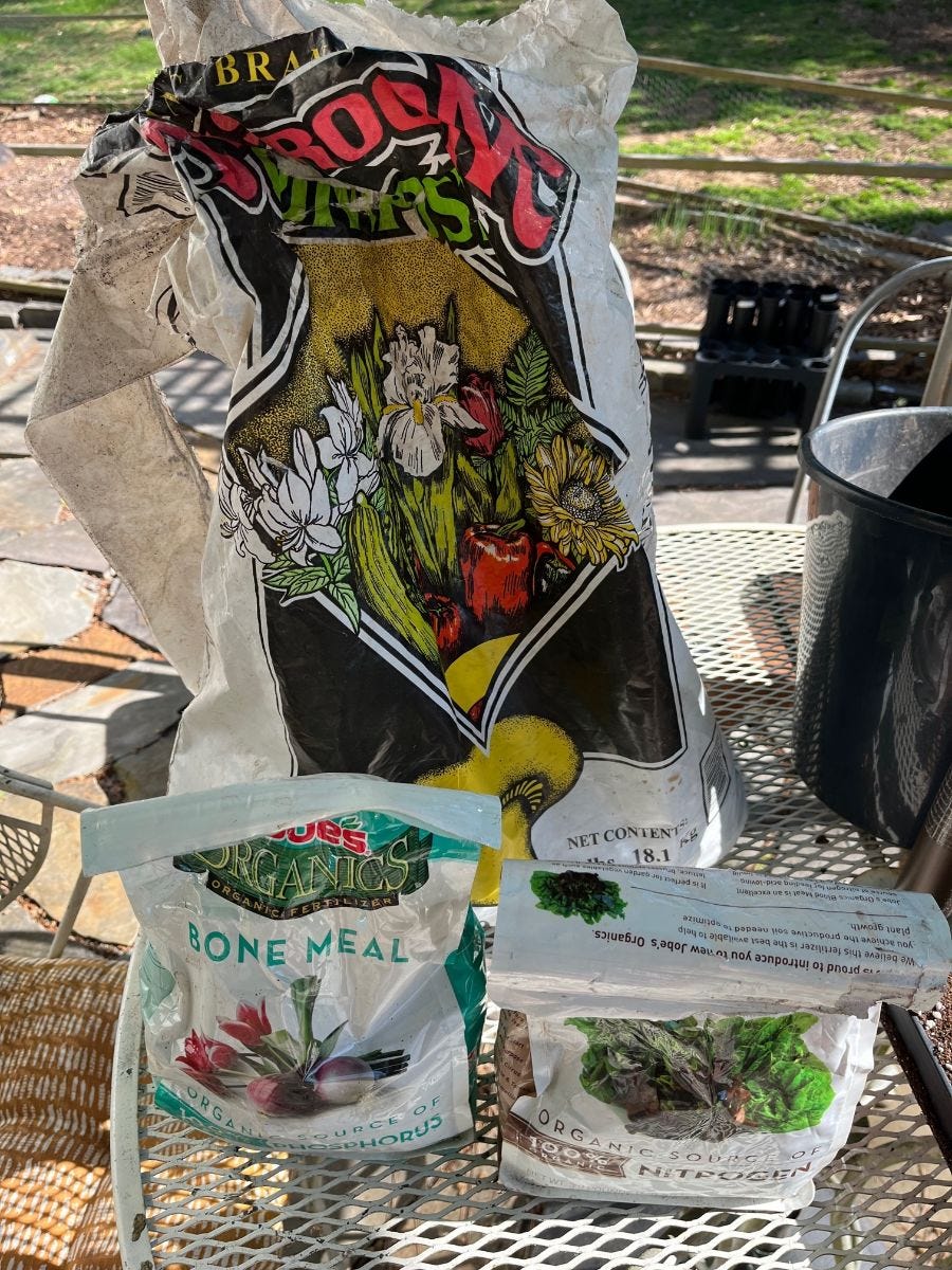 This is some of the stuff I add into my seed starting mix. Compost (in the back) bone meal (phosphorous), and blood meal (nitrogen). If I have it on hand I will also sometimes add rock powder (micronutrients) and mycorrhizal powder (benefecial fungal innoculant). It's always changing and sometimes does better than others... But doing it like this isn't great if I am trying to teach or help others with it.