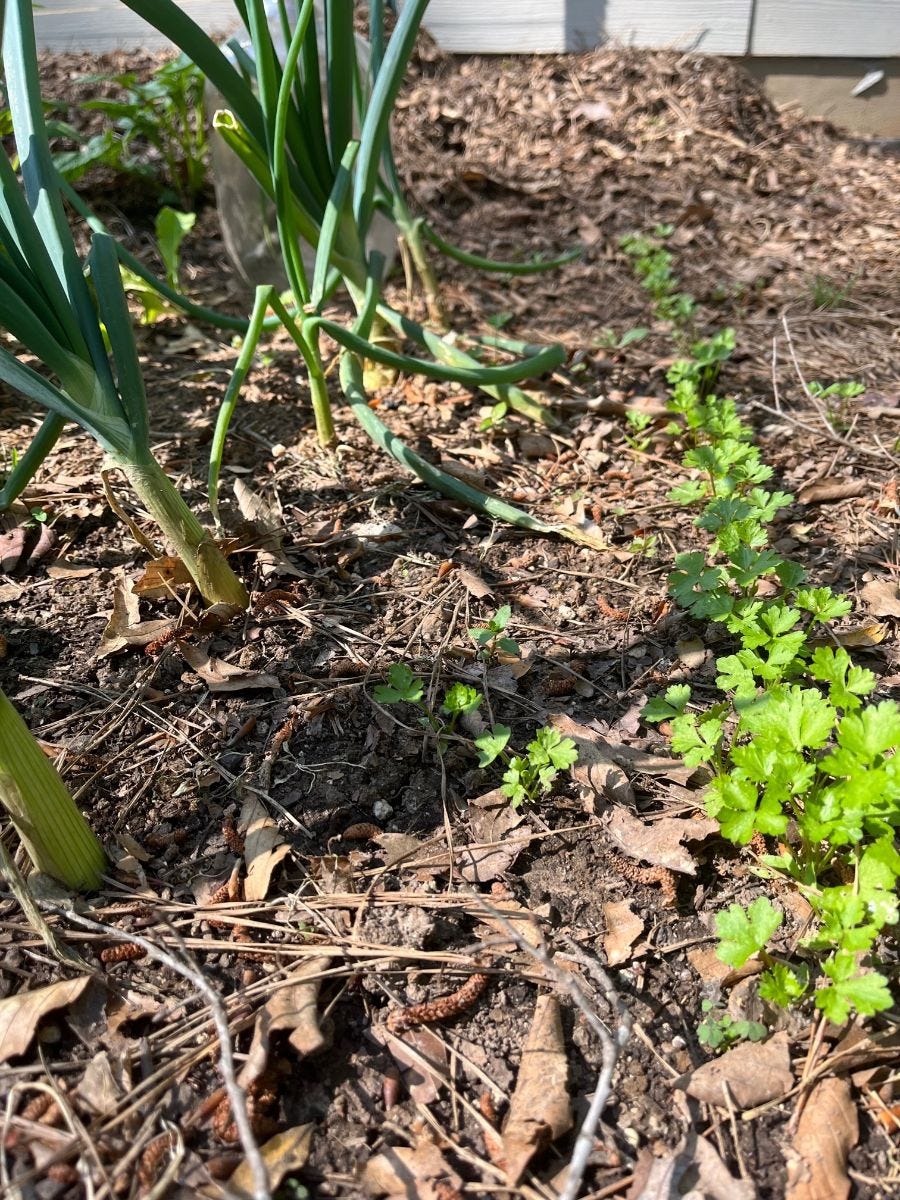Onions doing well on the left. Parsley on the right.