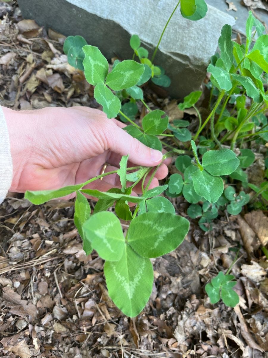 This is Red Clover. (Not Crimson Clover) There are many reasons that make Red Clover an excellent plant for gardeners to incorporate into their garden rotations. It has a long tap root that helps break up hard pans and increase water infiltration. It's a legume and fixes nitrogen from the atmosphere into the soil. It has a flower that insects, including honey bees, love. These flowers also make a great herbal tea! We will collect the flowers and add them in our hot and cold teas throughout the year.