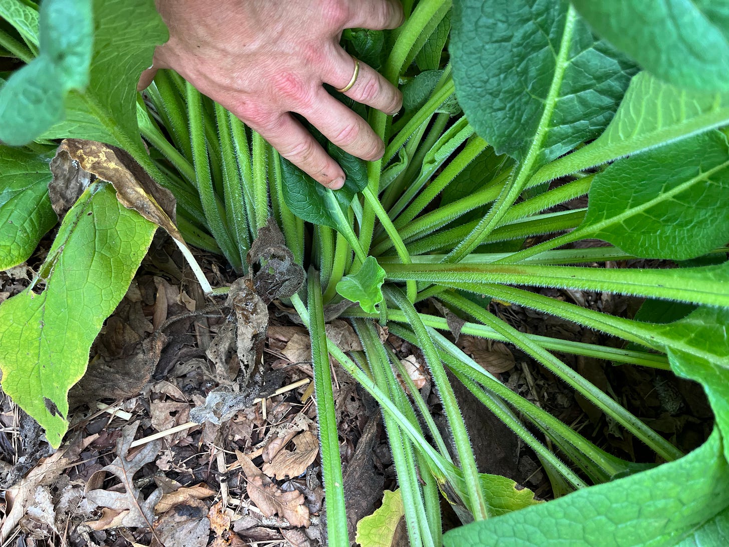 The long tap root and the productive growth of the comfrey plant make it useful for a few different applications. Because it has such an extensive root system and in particular a long tap root, comfrey can mine nutrients in deep soil horizons where other plants typically do not reach. These nutrients are deposited into its leaves which are produced in mass each year. This ability to cycle nutrients from deep in the soil upward, makes comfrey and excellent companion plant in orchards and on garden edges. The leaves make a great mulch amendment as well as a great treat for chickens.