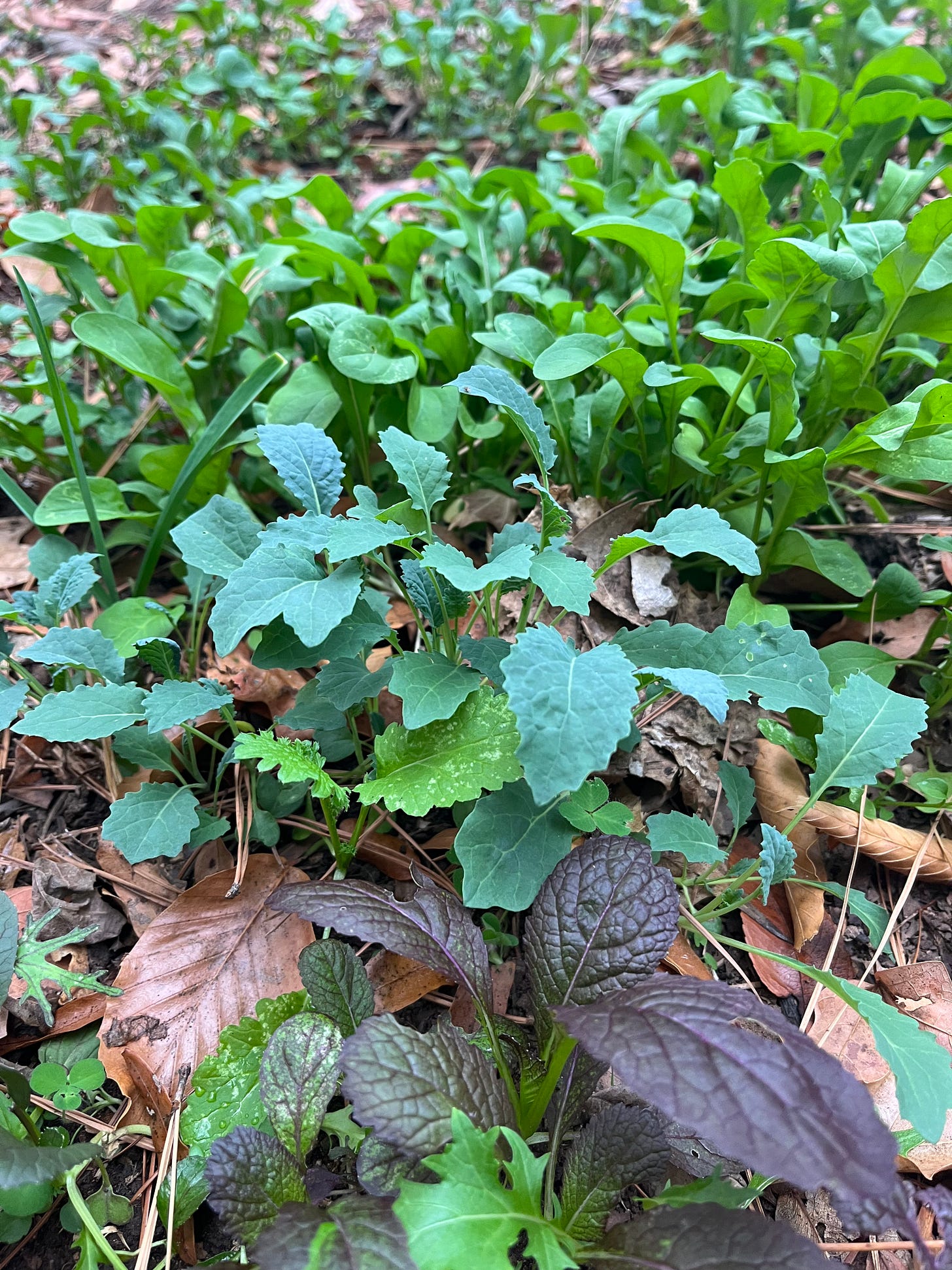 When we were growing for market, I used a push seeder. I went to find my seeder online to link it and it looks like Hoss has a different style now. Also, boy! seeders are expensive. I’m hesitant to link any seeders or recommend any because quality is very important and without using one prior, I don’t feel good about recommending one. Especially considering their cost. However, if you have a big garden space, the seeders make planting really easy. In our home garden, I just seed by hand. I show what we did this fall when seeding greens in a recent newsletter. It’s really simple. You just loosen the top of the soil a bit, make some rows a few inches apart, drop seeds in the row, cover your rows, and water them in. You can grow multi-cut salad greens in pots as well. You can mix them into established flower beds, even. Most greens, grown in healthy soil, have a deep green color, often with hints of blue and purple. Some salad greens aren’t green at all. Red mustard is, you guessed it, red. And they look really beautiful.