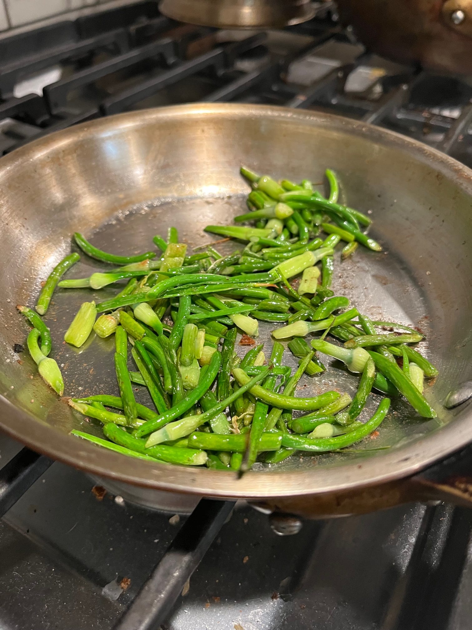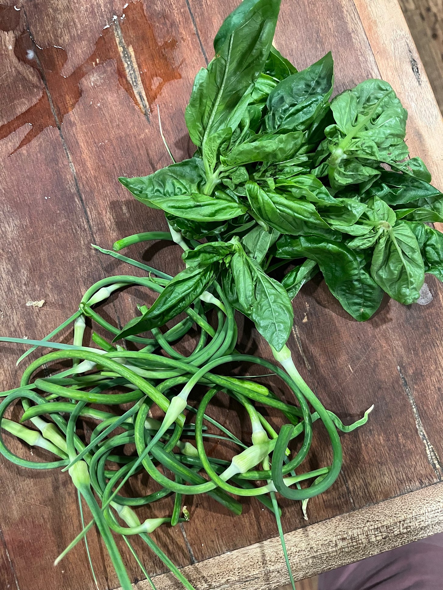 June is usually the time of the year to harvest garlic, but before then, you get another harvest - Garlic Scapes. These are the long, curly shoots that emerge from the tops of garlic plants and eventually form into flower buds. They are very tasty and easy to cook with. Simply cut them at the base, cut them into 1-inch pieces, add some butter to a pan, and sautƩ them up. They are delicious. They can also be added to stews or soups, made into sauces like pesto, or pickled in vinegar and sugar for a nice refreshing summer treat.