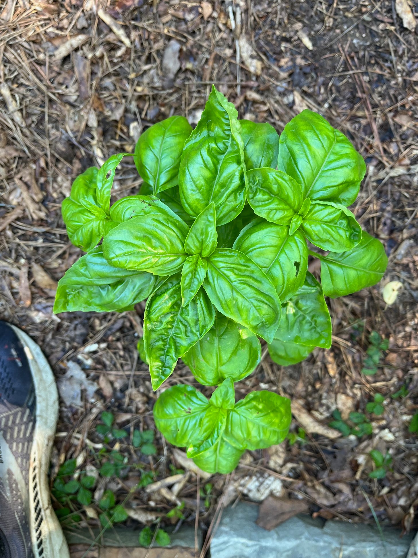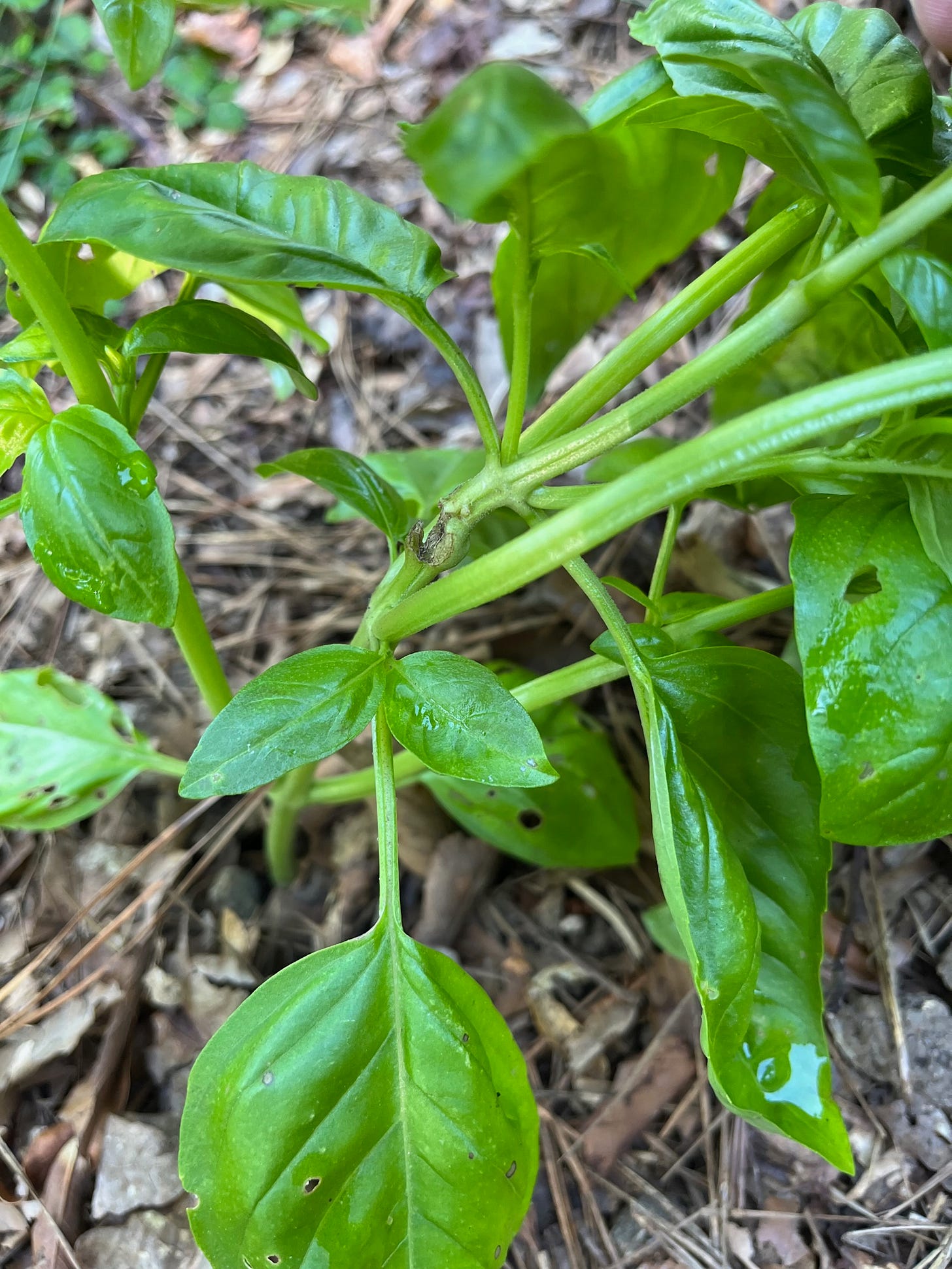 It was just a few years ago that I learned to "pinch" herbs without fully cutting the stem. By leaving the main stem intact but pinched, it still signals to the plant to bush out while allowing it to continue growing along the central stem as well. In theory, this produces more vigorous and bushy plants.