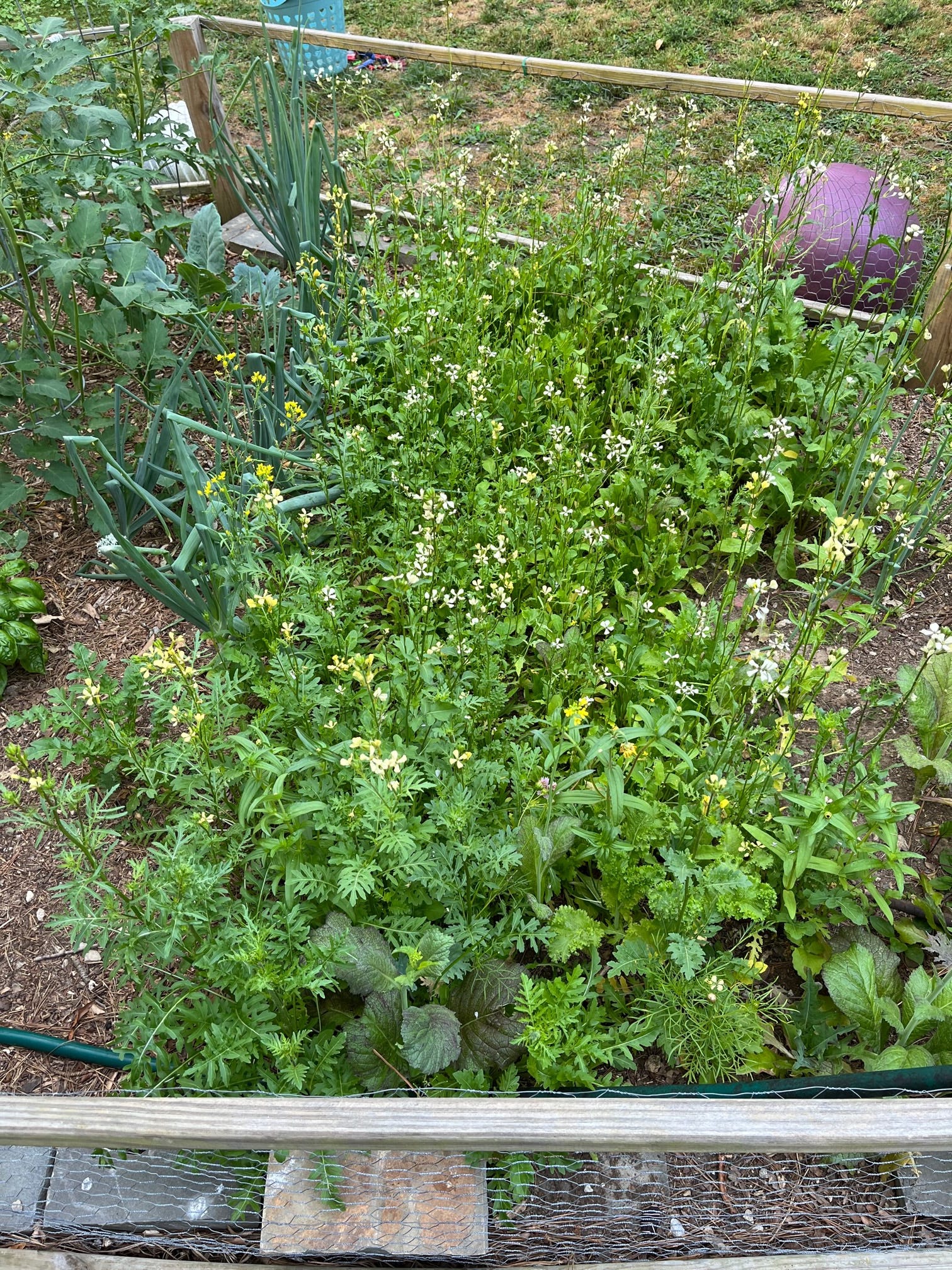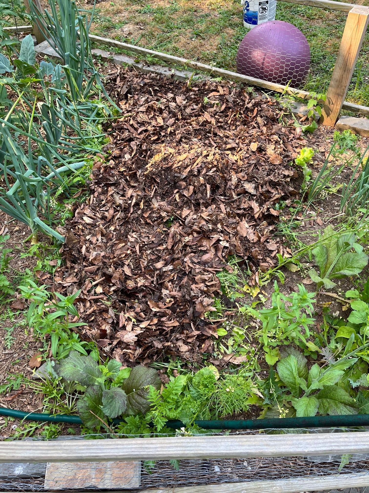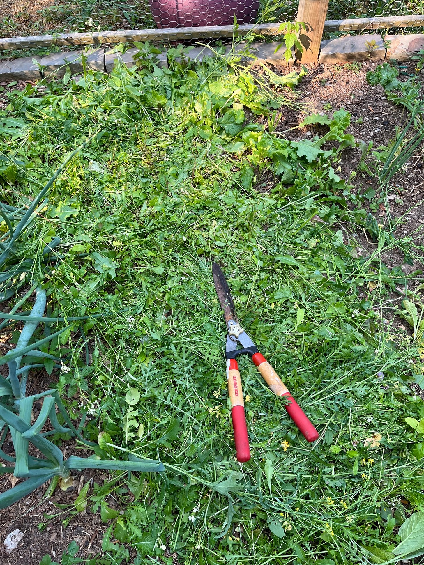 Morgan planted a few rows of arugula, mustards, and lettuces this past spring. They did great for a few months, but once the temperatures started to warm up towards the end of May, they started to bolt (flower). When that happens, their flavor and texture really take a hit, and it means it's time to remove them. To do this, I just used some loppers to cut the greens down to the ground and then covered the cut greens with mulch.