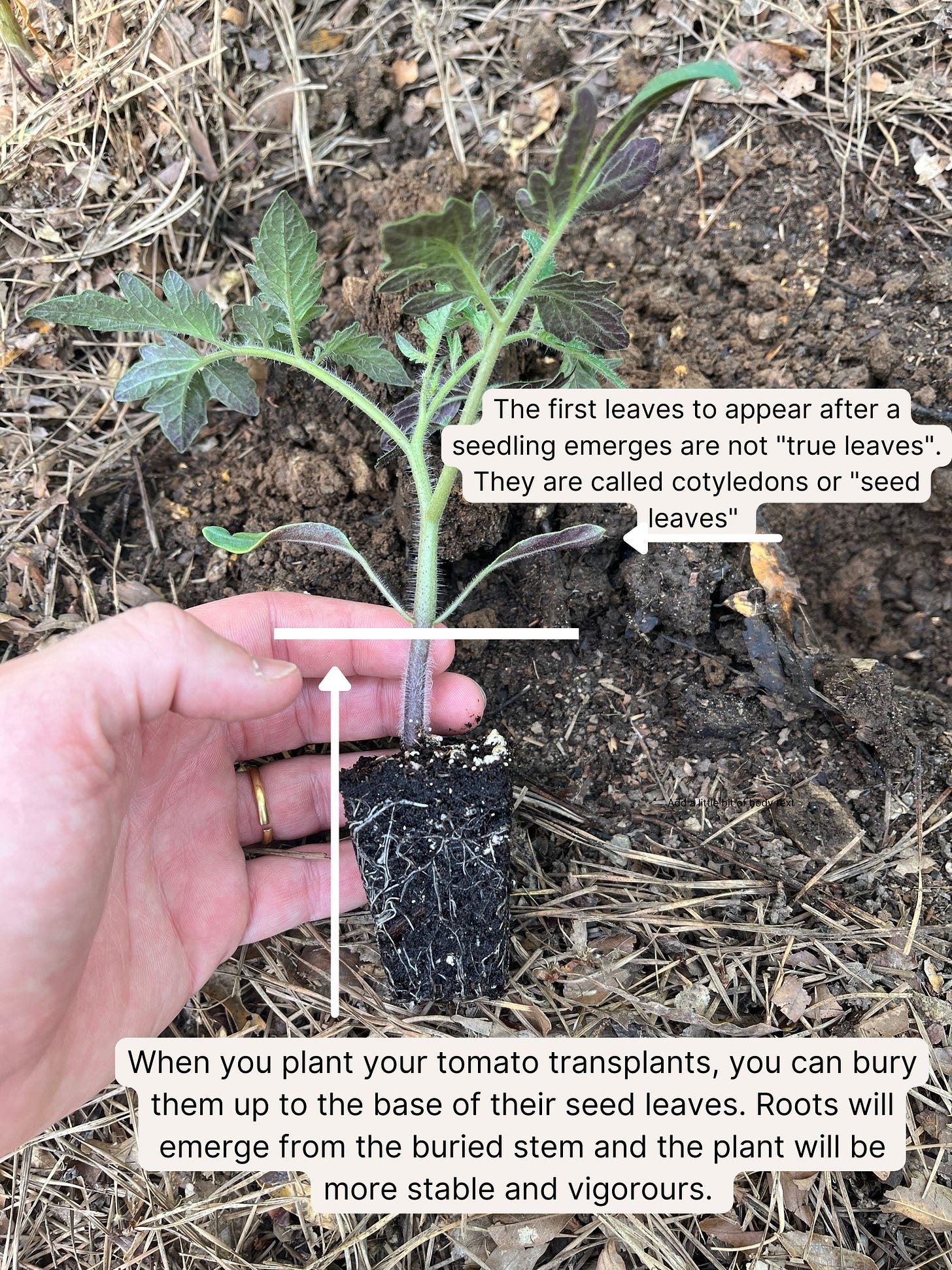 Have you ever transplanted tomatoes before? Did you know you can bury the stem up to the “seed leaves” and that it is actually advised to do so? Check out the picture below for an explanation!