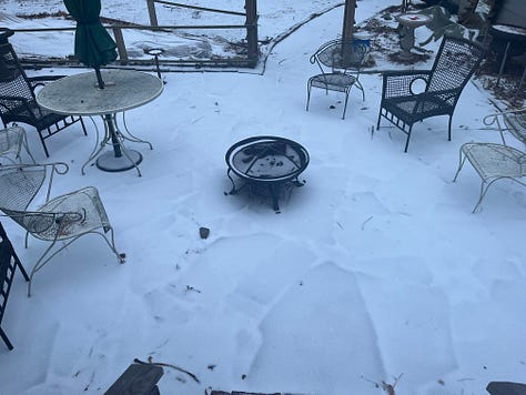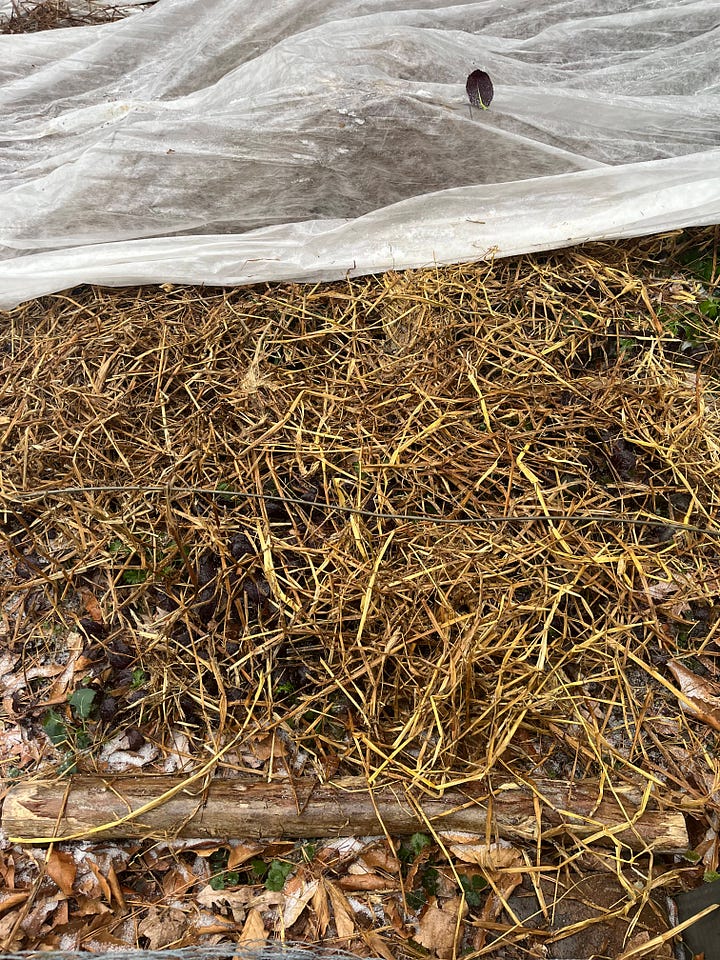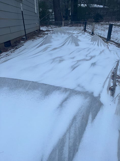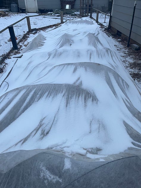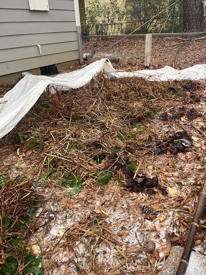 After the straw, I laid down three sheets of frost cloth. I reuse these cloths each year and a couple of them have holes in them. Additionally, two of the three don’t stretch across the whole garden. So some of the ends were only covered with two sheets. The retailer I purchased these cloths from say that one “1.0 oz Medium Weight” frost sheet protects down to 24 degrees and has 70% light transmission. So what happens to the insulation properties when you double/triple the sheets and add some straw underneath? I don’t know except to say it can’t hurt. Right? Also, how much light is getting through when you add the straw and extra sheets? I don’t know. On LinkedIn, I wrote about how I was going to try and save the garden, and Benjamin Fahrer commented to say he thought the plants could last roughly 2-3 days under that much cover. This felt right to me. Only problem with this was the fact that once the sheets got wet and froze, removing them was impossible without destroying them. Additionally, once removed, I would have to put them right back over the garden to protect against the second wave of single digit nights.
