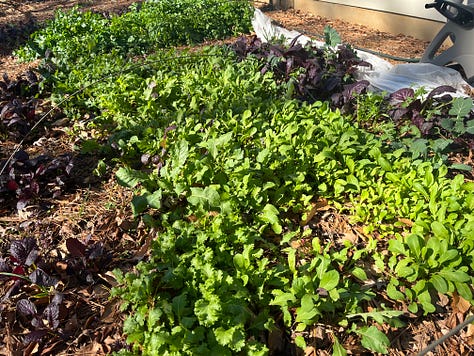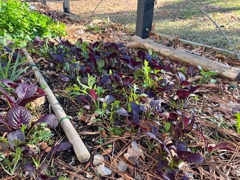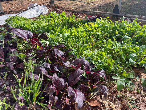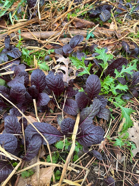 Planting winter hardy plants makes a big difference. This seems obvious, but outside of placing a heated greenhouse on the garden, I don’t think brocolli, cabbage, and kale would have survived under the straw and coverings; primarily because of how far away from the ground (heat) they would be. The salad greens I have in the garden (arugula, kale, mizuna, mustard) are all low growing and winter hardy varieties.