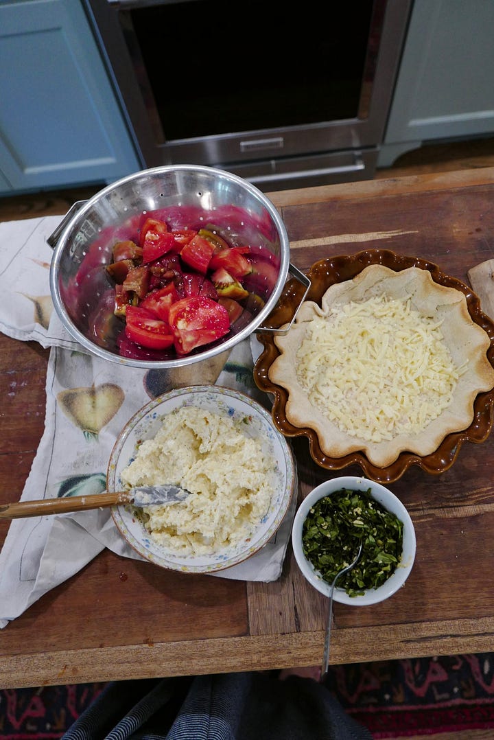 Another idea for using your tomatoes is tomato basil pie. Morgan’s grandmother, Nana, makes these pies for us and now Morgan has continued this tradition - much to my delight. They are simply incredible. But know this - they should only be made with vine ripe, local tomatoes. Preferably from your own garden!